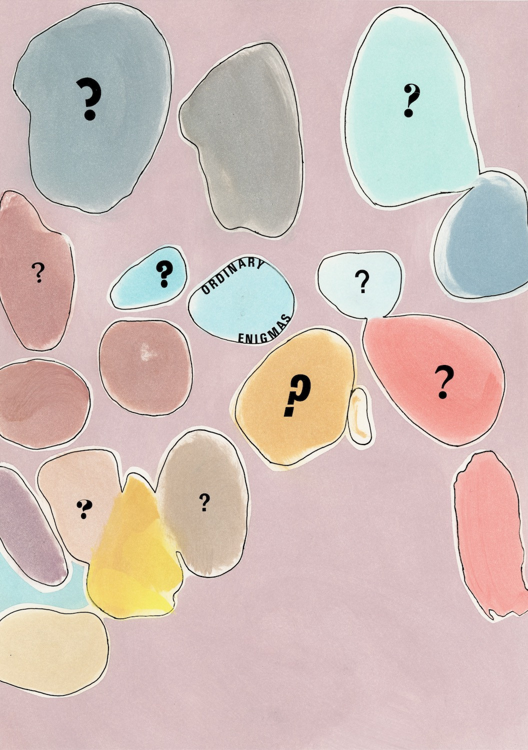 Question marks litter the first page of the first chapter, announcing the title of the series: Ordinary Enigmas. The image evokes a game at a cellular level; a game of manipulation, one to be staged by numbered sequences and the classification of visuals, appearing to revitalize itself by consuming human flesh. Later, Schmalz drops in words as clues that could potentially reveal his thought and fabrication process, although in paradox they tend to complexify the game mindset. Despite being deployed in a well-conceived structure, the narrative of these works is not linear. Tempted to deploy a loop or spiral, Schmalz instead plays down his watercolor morphologies by dispersing them. Together becoming more like a cloud, these works cultivate a certain synergy between their dynamic components.