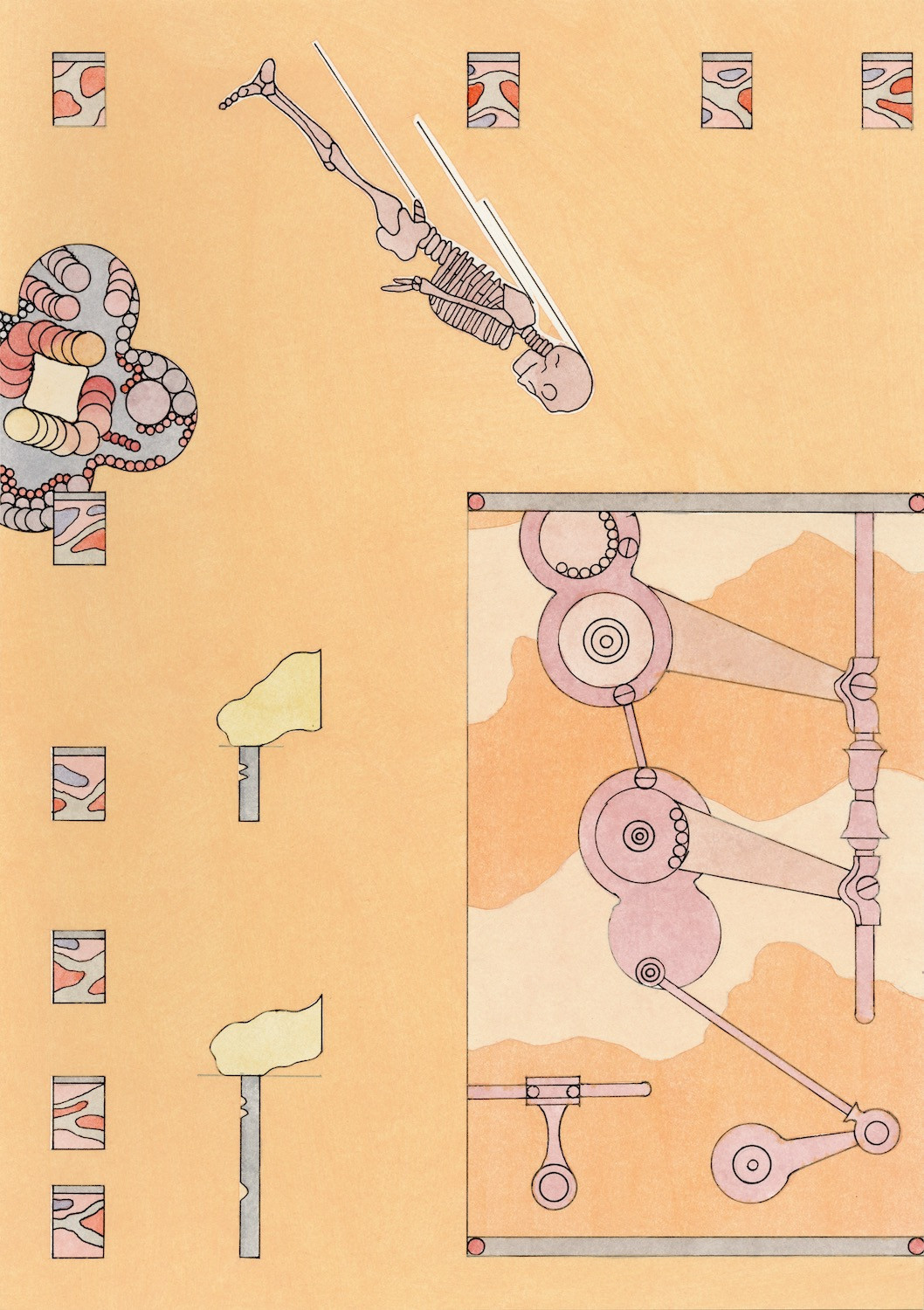This new series of watercolors is systematized by Schmalz in a specific order, structured by three chapters and their prologue. It opens with three pieces (Prologue A, Prologue B, Prologue C) composed of motifs that recollect an industrial setting through an ensemble of smoking chimneys, pointed roofs, pistons, and cogwheels. Reminiscent of comic strips, strange disruptive organisms also appear from portals within the image. Next, a human skeleton catapults stiffly toward a well-oiled machine, concluding the prologue by it breaking down.