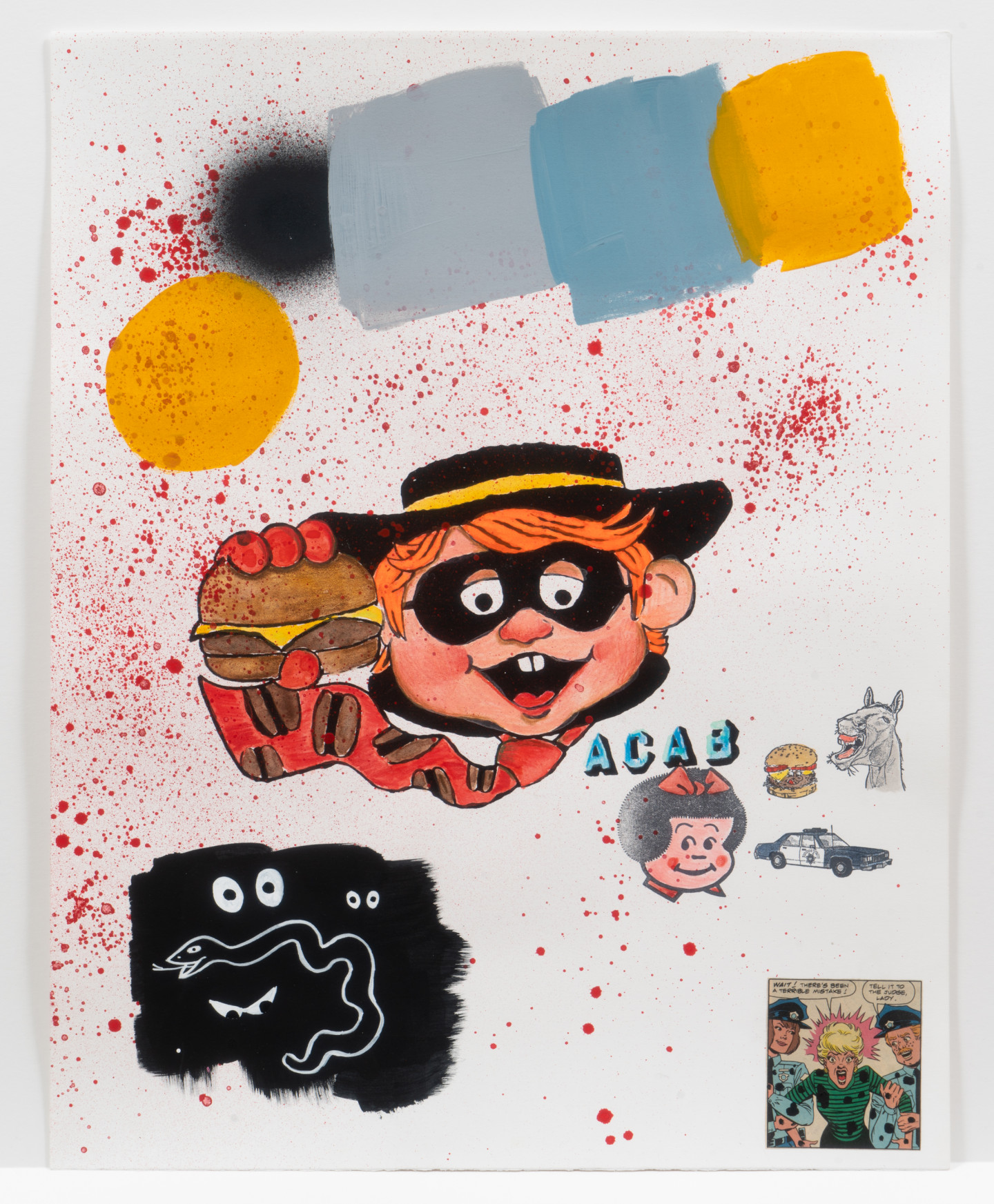 Collage, screen print, acrylic, ink, watercolor, color pencil, and rubber stamp on paper