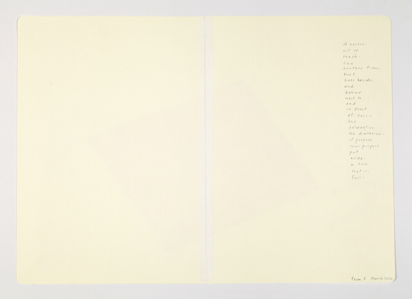 from 5 (it hovers / out of reach / like / another time / that lives beside / and behind / next to / and in / front / of days / the delineation / of purpose / your purpose / put aside / a hole / that is / full / more full)