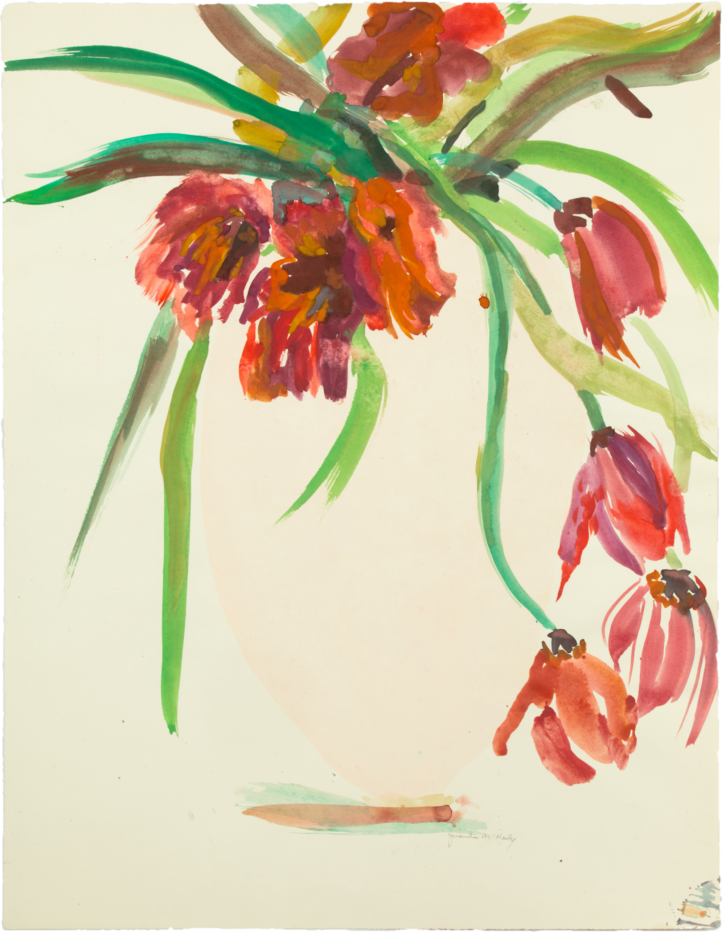 Anchoring the large works for which Juanita McNeely is known, the artist's works on paper offer an entirely other, intimate perspective to her paintings. McNeely’s sketches and watercolors on paper represent the bridge between her sharp observations of life in progress and the transfer of these visions into her paintings on canvas and linen, sometimes spanning across multiple panels. And while McNeely’s work is by nature figurative—most recognizably depicting the human body in states of pain, pleasure, angst, and calm—this presentation of watercolors on paper bring to light a private, reflective corner of her practice, recording the changing figures of cut flowers that have been present in her home and studio. For McNeely, flowers carry a distinct beauty and personal significance in their continual cycling through flourish and decay.