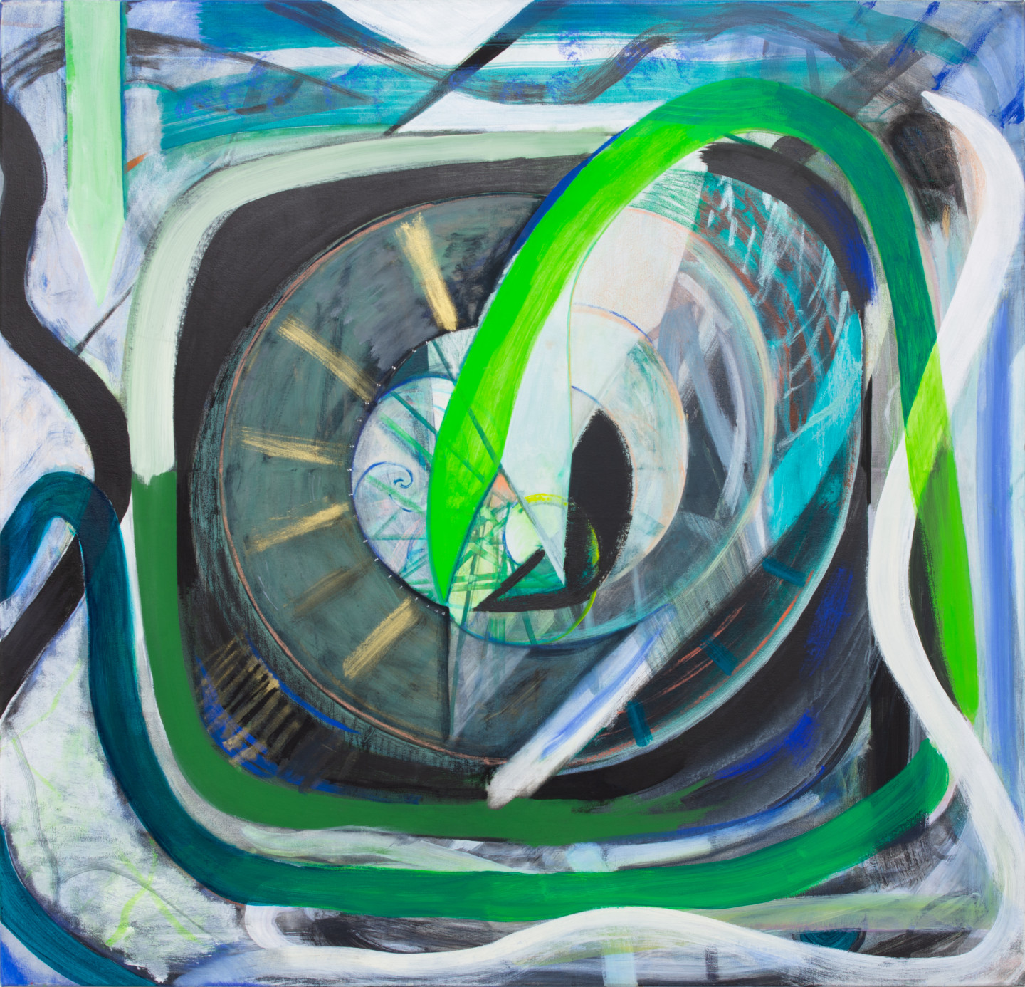 Many of these works adopt a play on words within their titles, forming further entry points to deciphering their hidden references. Best Intentions seems to unfold like a map made out of stained glass—and while the title is meaningful in various ways, the artist most immediately wanted to register her own best intentions in using a fragmented female form. Saint Lucy draws reference to Domenico di Pace Beccafumi’s 1521 painting of the same subject, and was made while working simultaneously on Spontaneous Generation, wherein the platter holding the Saint’s eyes transforms into a deep red orb. The title also sparks an association to the concept that all things once evolved spontaneously from mud, speaking more broadly to the process of creation involved in these works, with mud being understood as the opposite of nothing. In a painting like Birthday, the title became a way for Saddington to resolve the image, injecting the sort of woozy cheerfulness felt on a birthday, while at the same time suggesting the physical nature of the birthing process through its spiraling imagery.