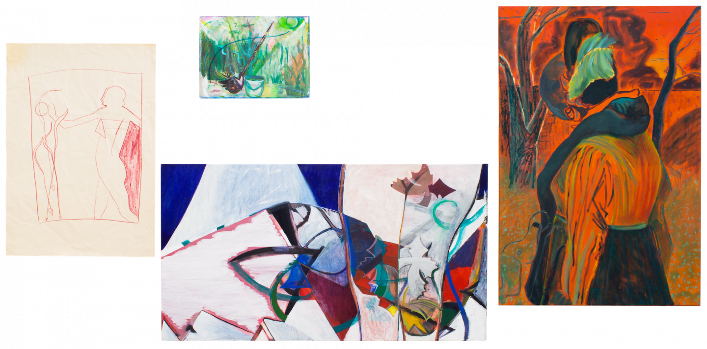 Amelia Saddington’s paintings and drawings present a simultaneous flow of thoughts and responses. Working in an intentionally open, improvisational manner, Saddington allows the process of making to bring about its own moments of surprise and resolution. While there is a specificity within her selection of starting points—for example, responding to a particular TV-production of Pride and Prejudice, or the placement of used boots on a sidewalk, through which the artist injects reflexive sensibilities like humor or agitated exuberance—the work tends to speak from and for itself as it comes into being. Through this working process, Saddington produces new and different kinds of signs in response to a search for meaning in the visual plane. In turn, the ways in which images and language might be subverted or misunderstood becomes a highly generative factor at the core of the artist’s work. The selection in Aerogram Sonogram offers an overview of Saddington’s more recent investigations, which merge observational images, imagined landscapes, and reconfigured imagery.
