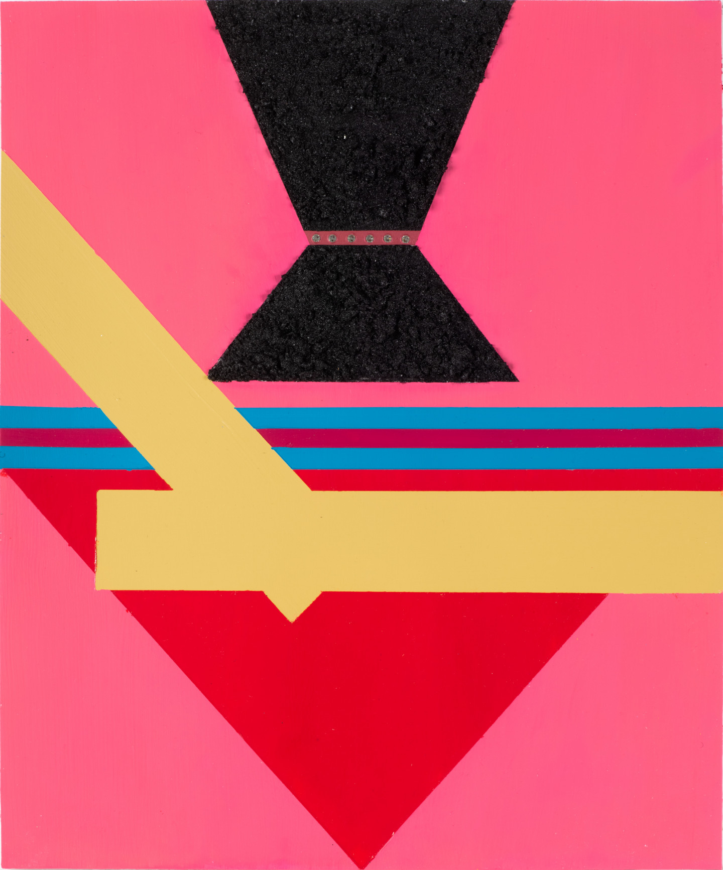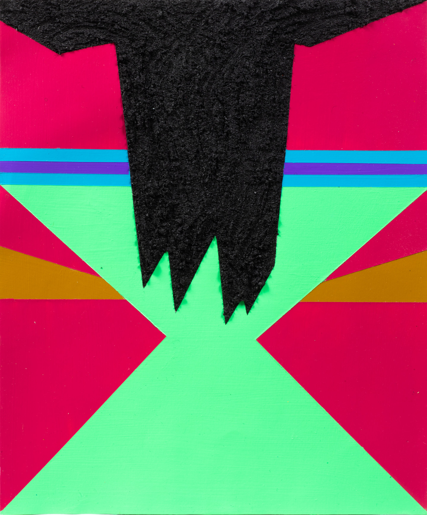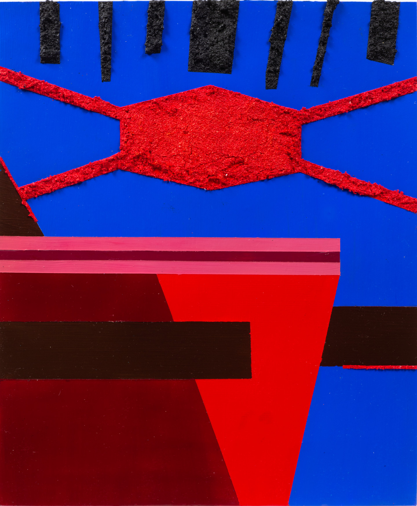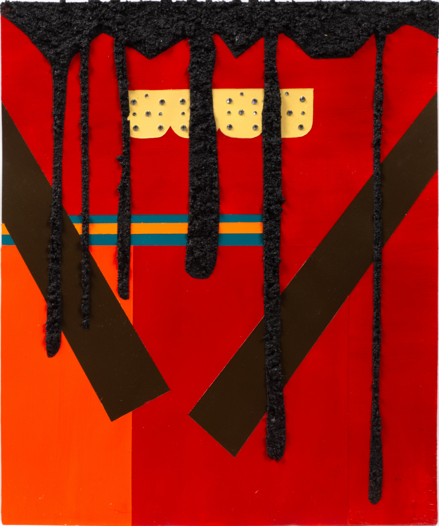 Peterman set out to capture the notion of “What You See Is What You See”. Through this construction, Peterman breaks down the visual elements that inform an APB, pressing at its translatability. Combining flatly painted areas with textured zones using sand and crystals, Peterman engages this process of categorization while also pointing to the nature of scale that informs it. Here, the bodies of people are visually reduced to geometric color and form within a limited rectangular frame. By focusing in on these details, within each work Peterman creates a singular instance that points to the occurrences every day in which black and brown bodies are placed into categories, whereby no reference other than skin color, hair, and clothing might be applied. Thus, these works reflect, “What They See Is What They See’': a flattened color and form, subjected to racial injustice within a long history of predisposed cognitive brutality. In this series, the title of each work informs its contents, collapsing the cognitive processes involved in an APB within the moment of reading the artwork.