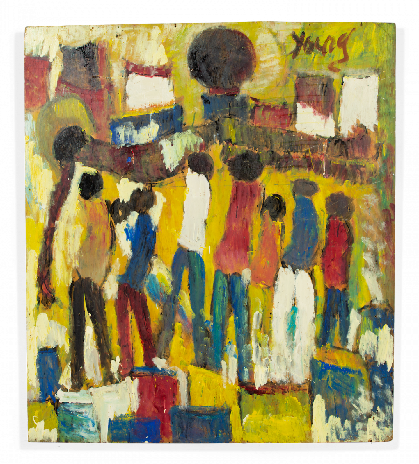 Young was self-taught, producing a remarkable number of works over his lifetime that convey rich scenes—at once pictorial and spiritual—of his life spent in the inner-city Miami neighborhood of Overtown. Informed by an early practice of drawing from life, Young began making paintings in the 1960s. Blending techniques of painting, drawing, and collage, Young collected discarded materials found on the streets and in abandoned buildings across his locale to incorporate as the surfaces for his work. Elements of action, figuration, and storytelling are laid over a series of structural devices, activating the ways in which the found materials onto which Young painted would serve to frame the images placed upon them. While some of these panels are smoother or more straightforward in proportion, others approach a mode of assemblage that reflect the variable and multi-layered narratives found across the artist’s work. The materiality of Young’s paintings reflects the artist’s own relationship to architecture, place, and time in Overtown. This sense of site-specificity is translated when encountering the works in person, whereby the panels offer a certain reconstruction of the environments from which they once came.